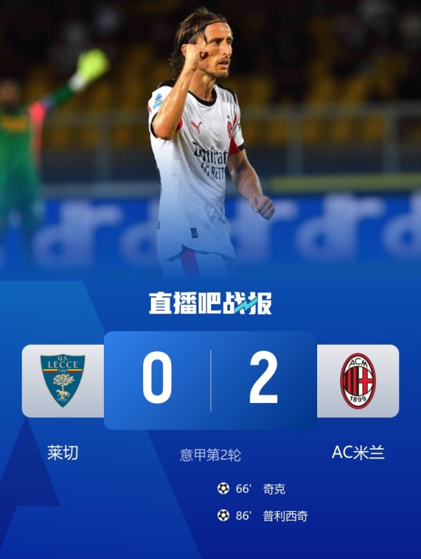 意甲第2轮,AC米兰2-0战胜莱切,奇克、普利西奇进球。