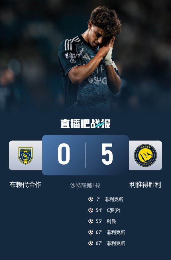 沙特联第一轮,菲利克斯帽子戏法,C罗、科曼进球,利雅得胜利5-0大胜布赖代合作。